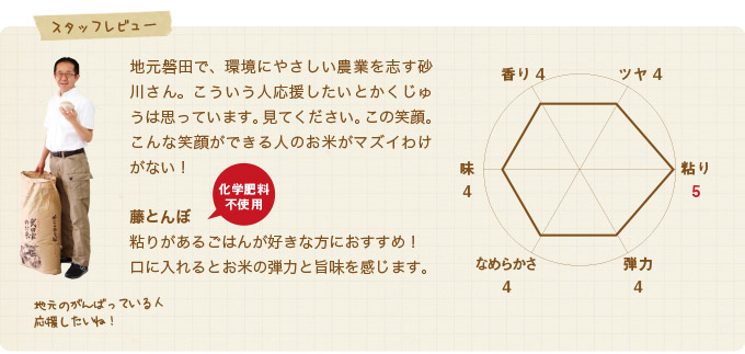 砂川さんの藤とんぼは、除草剤を1回のみ使用したお米です。苗作りの時も種子消毒を温湯による殺菌で行っています。肥料も米ヌカなどの有機肥料を使用して栽培しています。